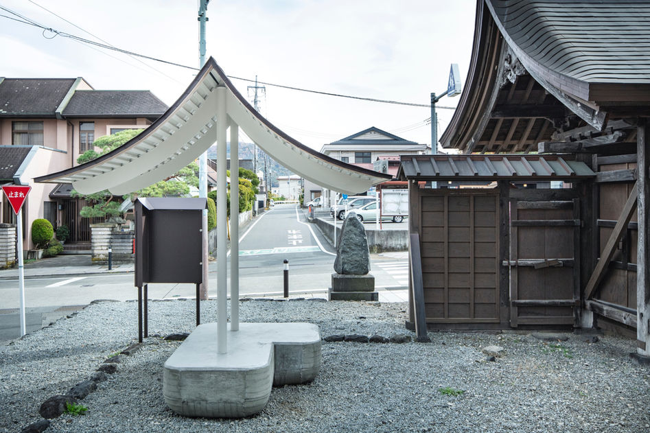 高校生の活動拠点「センゲンボウ」の庭を整備するプロジェクト。2022から2023年にかけて実寸で検討を重ね、設計した。富士道に立つ文化財の門に呼応するように、軽やかな屋根と庭石のようなベンチを作った。